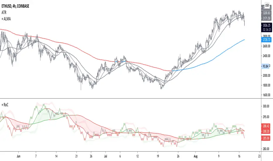The Rate of Change, or RoC, is a momentum indicator that measures the percentage change in price between the current period and the price n periods ago. It oscillates above and below a zeroline, basically showing positive or negative momentum. I applied the OBV's calculation to it, but without the inclusion of volume (also added a lookback period) to see what would happen.