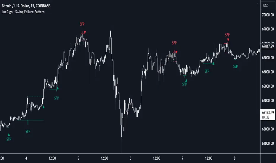The Swing Failure Pattern indicator highlights Swing Failure Patterns (SFP) on the user chart, a pattern occurring during liquidity generation from significant market participants.