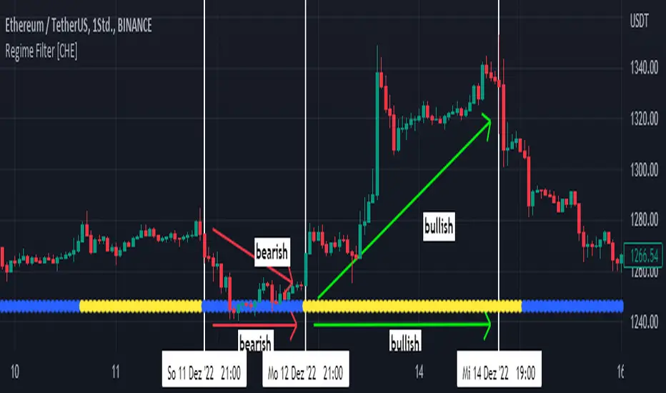 The regime filter uses the color yellow and blue, yellow stands for bullish and blue for bearish.