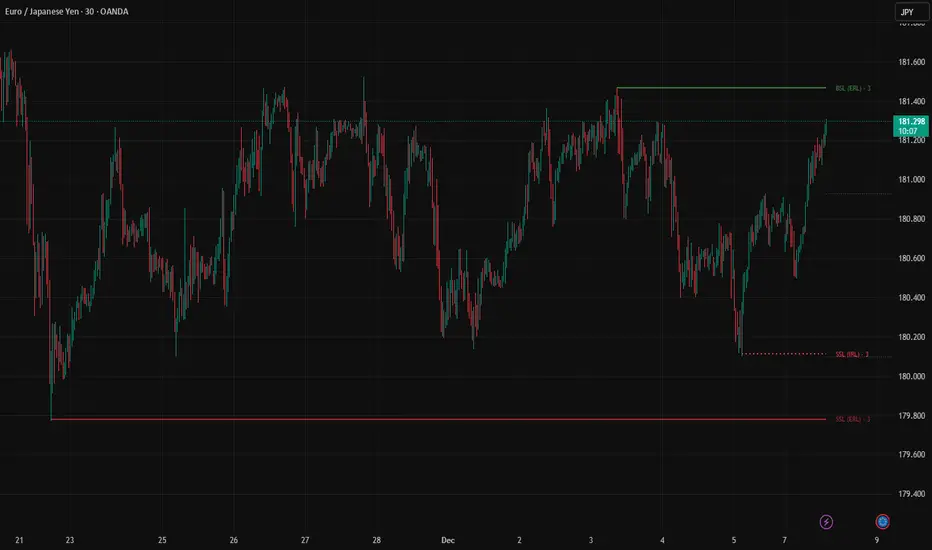 • SSL (Sell-Side Liquidity): swing lows clustered into meaningful levels (areas where stops tend to rest below price).
