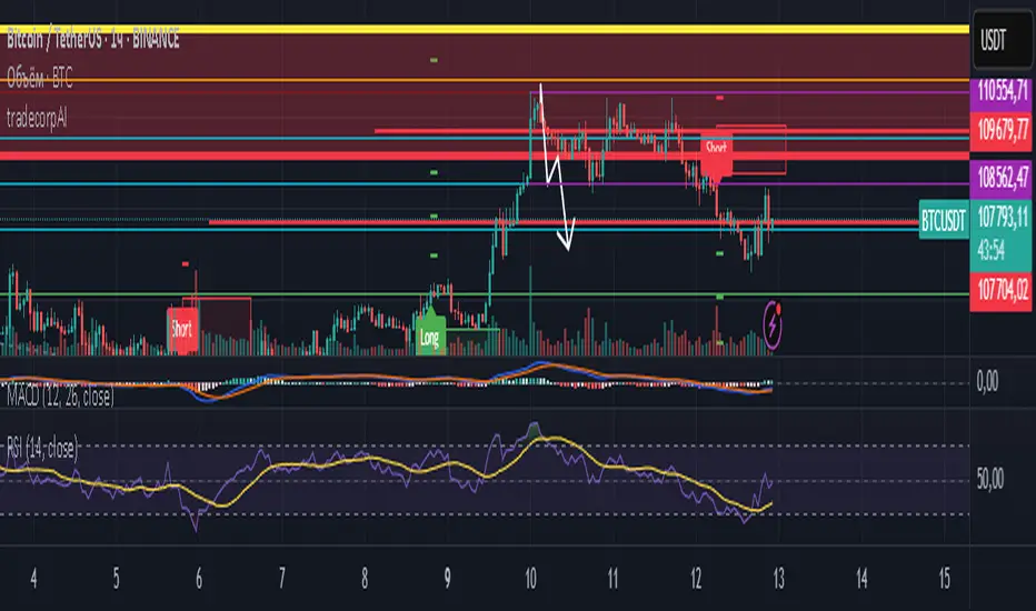 When a long/short signal is triggered (displayed on the chart), it is necessary to work from the dynamic trend line (green or red depending on whether the trend is growing or declining), as well as based on the levels (red\green)