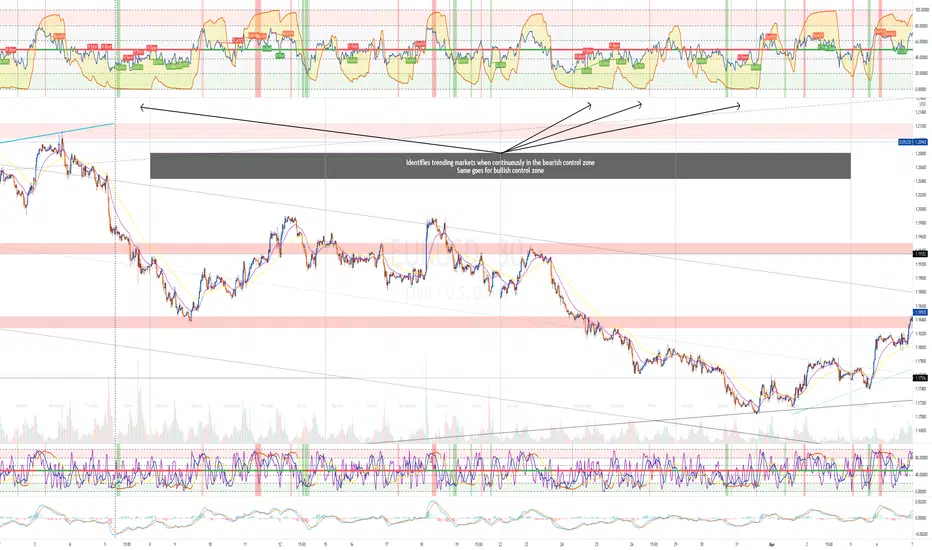 Configured with high smoothing to show trends in the markets (This value can be adjusted). When maxed out in either direction, can help to identify strong trends in the market.