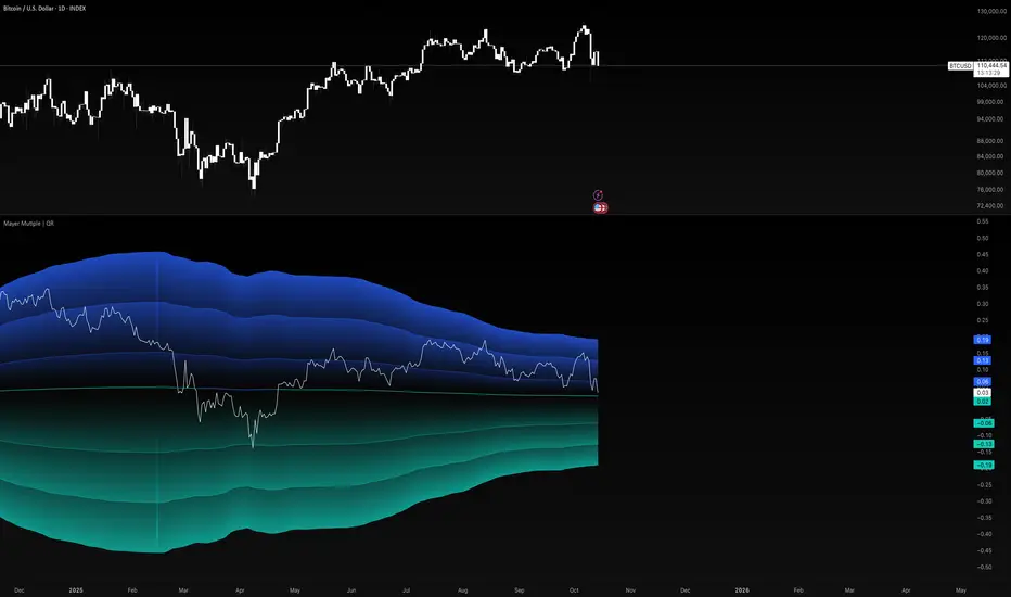 Mayer Multiple | QR is a cycle/valuation style oscillator that measures how far price sits above or below its longer-term average and normalizes that distance by current volatility. It helps you spot overheated extensions and deep discounts relative to trend, with adaptive bands that expand/contract as conditions change.