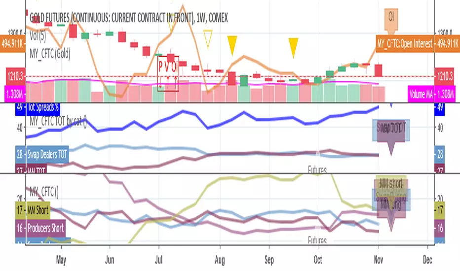 select and load CFTC COT data in overlay mode for Gold, Silver or Crude and plot OI and multiple categories graph
