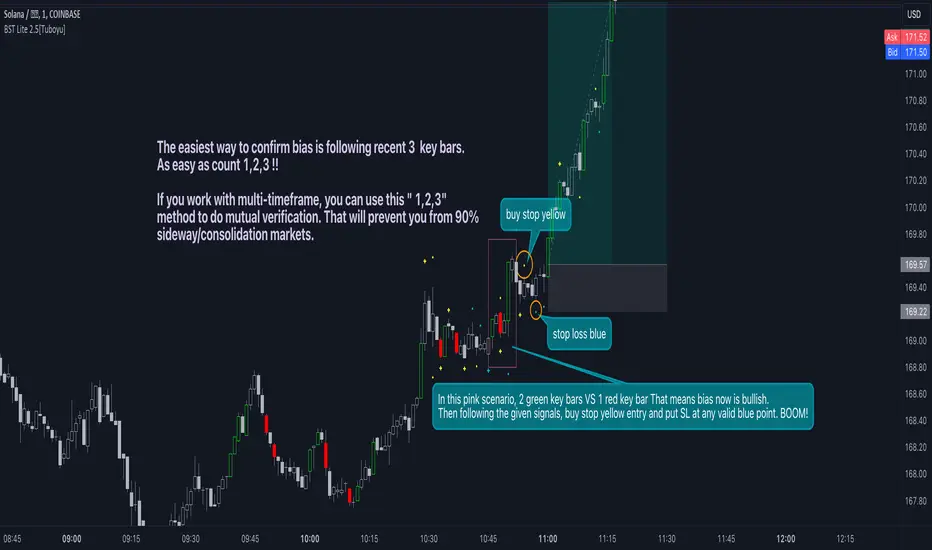 BST system is Entry Criteria based on the logic of price action which price always moves the way ' contraction-expansion-contraction', also known as 'stage1 & stage2' exchange. Stage1 means that price is squeezed back and forth before/after expansion. Stage2 means impulse or expansion to a certain direction. Both "late stage1" and "early stage2" are the best opportunity for entry. Oppositely both "early stage1" and "late stage2" are the best chance for Take profits.