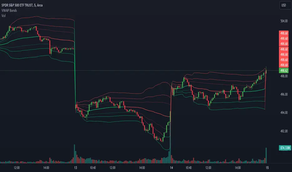 This script calculates the VWAP for each trading session and overlays it on the price chart as a solid line. Additionally, it plots multiple standard deviation bands around the VWAP to indicate potential areas of price extension or contraction. These bands are derived from multiplying the standard deviation of price by predetermined factors, offering traders a visual representation of potential price ranges.