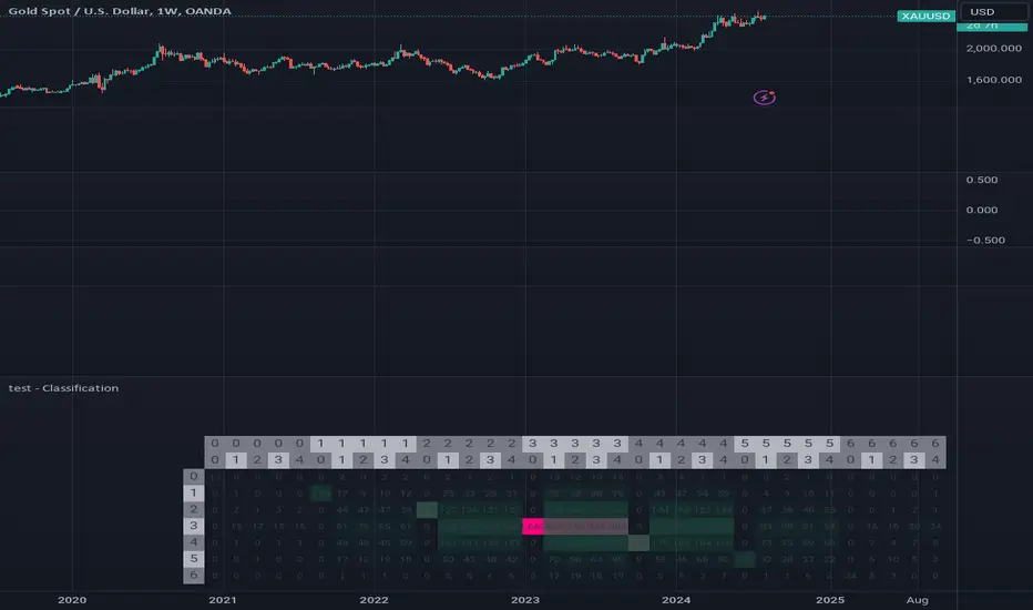 This innovative script represents an experimental foray into classification techniques, specifically designed to analyze returns within a compact time frame. By leveraging tensor-based analytics, it generates a comprehensive table that visually illustrates the distribution of counts across both current and historical bars, providing valuable insights into market patterns.