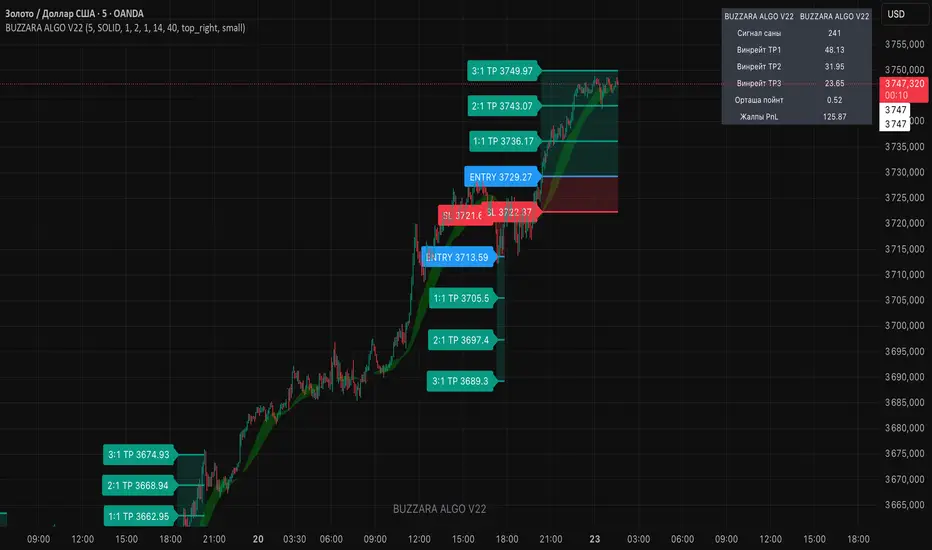 BUZZARA ALGO V22 is a complete trading system built on SuperTrend with Moving Average confirmation. The indicator automatically plots Entry, Stop Loss, and three Take Profit levels (TP1, TP2, TP3). All signals are saved historically, with TP/SL background zones that remain visible until the signal is closed or replaced.