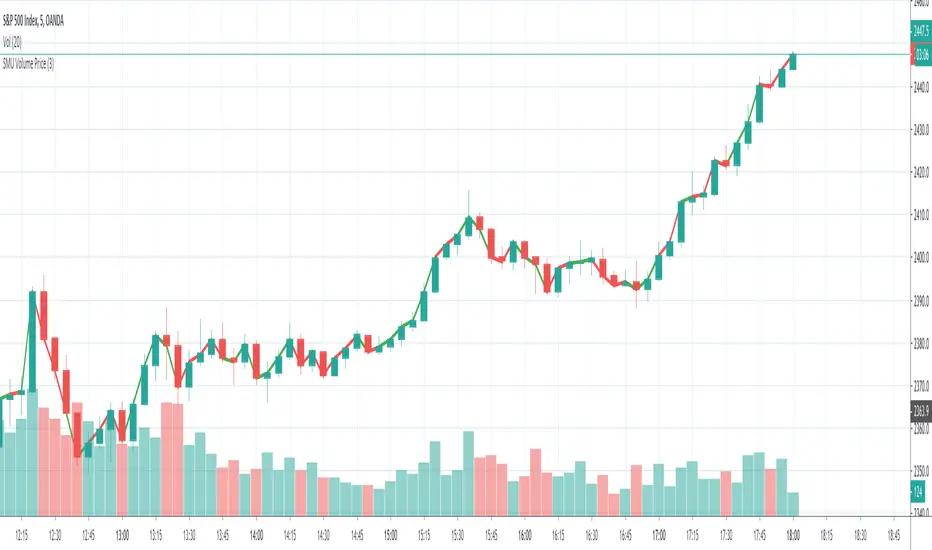 This very simple scripts shows if price drop or gain was on a upside volume or down side. It is a visual track on the candle reflecting the volume ROC overlapped as a price movement on the actual candle. So don't mistake it with a moving average. Red means volume was down even if price has gone up. Basically if a price goes up on a increase ROC volume then you can trust it. Otherwise it is likely that it won't last.