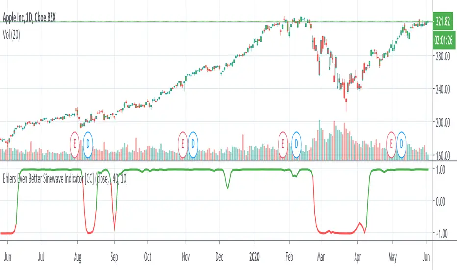 The Even Better Sinewave Indicator was created by John Ehlers (Cycle Analytics For Traders pgs 161-162) and this indicator works well when the stock is in a trend mode. It will let you know how long to stay with a trade and it works best with a trend confirmation but it can also work on it's own fairly well. Buy when the indicator line is green and sell when it is red.