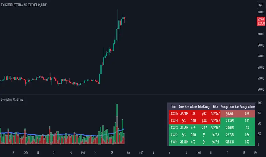 Deep Volume is an indicator designed to give you high fidelity volume information. It does this by utilizing real time data provided by Tradingview to generate a wide range of metrics. We have included a convenient column chart to visualize the polarity of the volume, and a table to see the real time data. This works by utilizing pine script's varip feature to get information within candles. This is convenient as it allows users to get lower time frame information without the use of ltf functions. The result is seconds level data with out the need to be on a lower time frame chart. As a result, as you increase the time frame of the chart the updates will become slower. This is because Tradingview doesn't update the chart information as frequently on higher time frames as there isn't as much of a need.