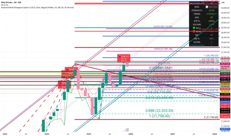 Auto calculates 15 indicators , assigns different strength to each and auto adds up to give a Final bias . Auto detects scrip & time frame . Sums up everything in a Dashboard. For educational use only