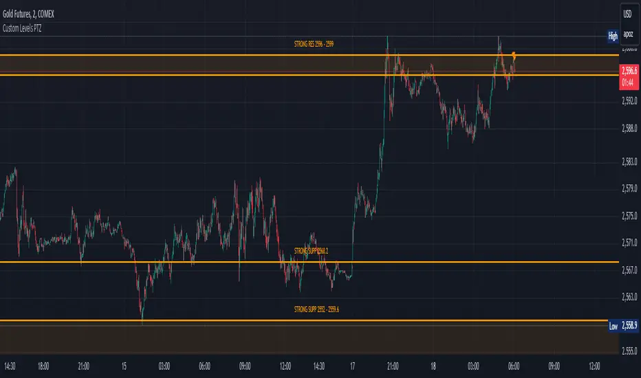 This indicator lets you easily plot support, resistance, pivot, and key levels on your chart. Simply enter your levels in a structured format, and the indicator will draw them as lines or zones, complete with labels.