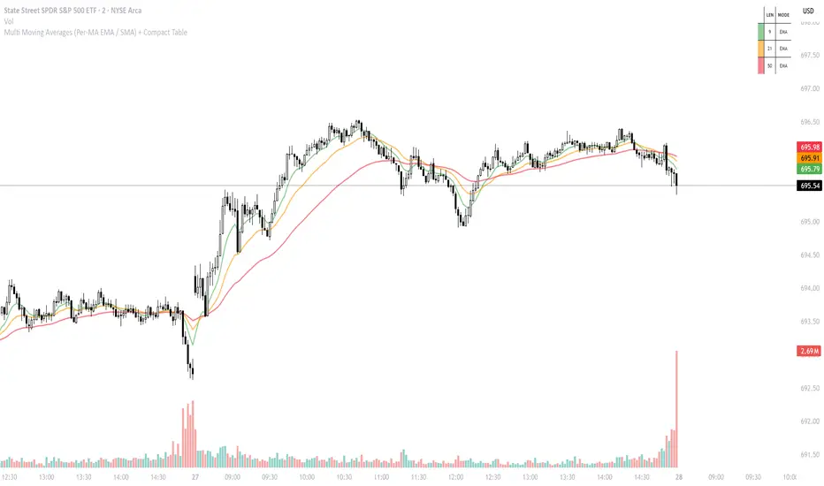 Multi Moving Averages (EMA / SMA Toggle) is a lightweight and highly configurable indicator designed to plot up to three moving averages on your chart with a clean and minimalist input panel.