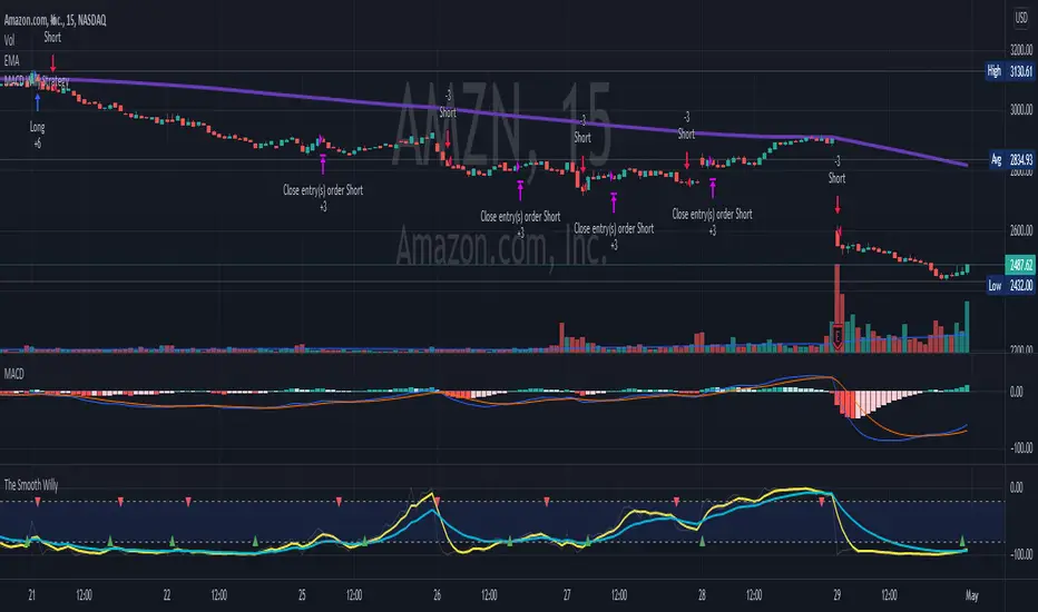 This strategy is mainly developed for scalping / intraday trading. It could potentially be used to identify entry/exit signals for short term options trading. It performs decently well on popular stocks when used on time frames between 5 min to 15 min using regular session bar data. It combines 3 popular indicators, EMA, MACD, and William %range, to generate both long and short signals.