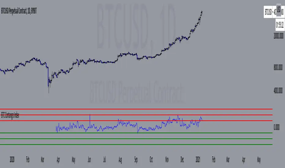 This is a script that shows the contango between spot and futures prices of Bitcoin to identify overbought and oversold conditions. Contango and backwardation are terms used to define the structure of the forward curve. When a market is in contango, the forward price of a futures contract is higher than the spot price. Conversely, when a market is in backwardation, the forward price of the futures contract is lower than the spot price.