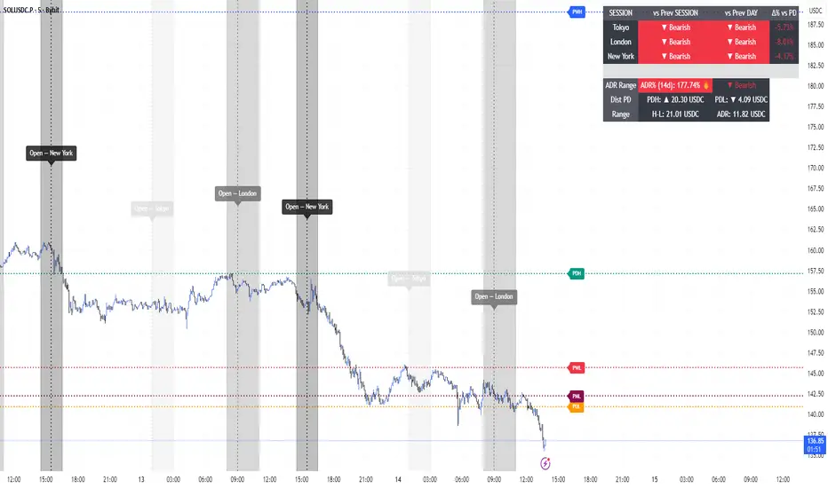 ADR Daily Range + Volatility + KZs — SMC/ICT (PueblaATH) is a complete intraday context and volatility HUD that plots market opens, killzones, previous period highs/lows, and a dynamic ADR/volatility dashboard. It is built to give SMC/ICT traders an at-a-glance view of when and where price is moving: sessions, overlaps, ranges, and distance to key levels, all on a single clean overlay.