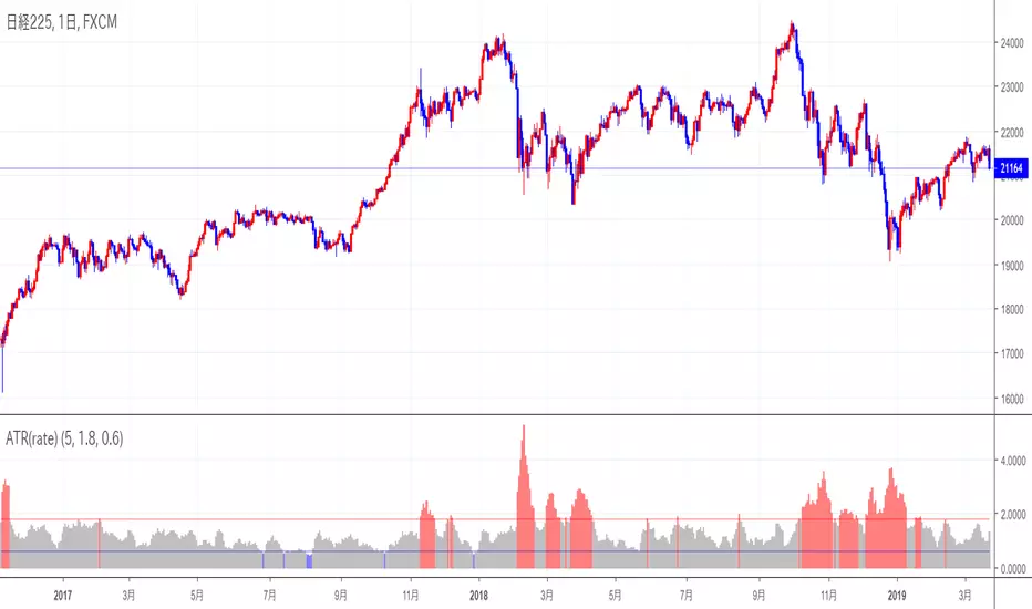 上と下にターゲットを設定し、ATR終値割合がターゲットより上になれば赤色、下になれば青色で表示します。