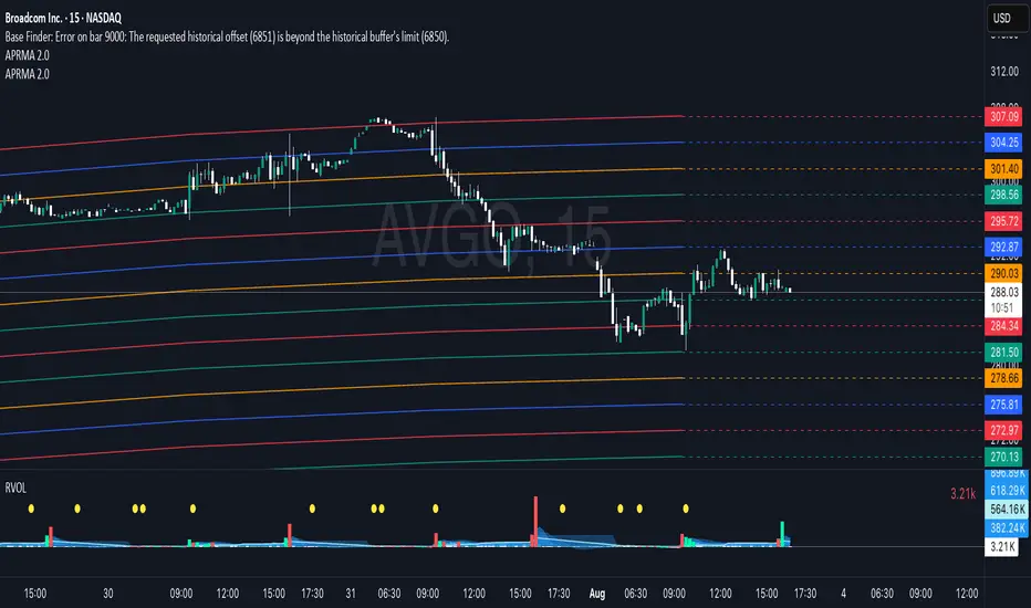The Adjustable Percentage Range Moving Average (APRMA), originally developed by reallywendy, is a versatile PineScript indicator designed for traders and market analysts to analyze market volatility and identify trends dynamically. Building on the original concept, this updated version plots a central moving average (MA) with four customizable percentage-based range bands around it. Users can select the MA type (SMA, EMA, HMA, RMA, SWMA, TMA, WMA, VWMA), timeframe, and length, tailoring the indicator to their trading style. Each range band (upper and lower) is calculated as a percentage offset from the MA, with adjustable colors and transparency settings for enhanced visual clarity. Extension lines project the latest values forward, with customizable styles (solid, dashed, dotted). The indicator includes toggleable display options for the MA and each range pair, making it an effective tool for identifying price ranges, support/resistance levels, and trend dynamics.