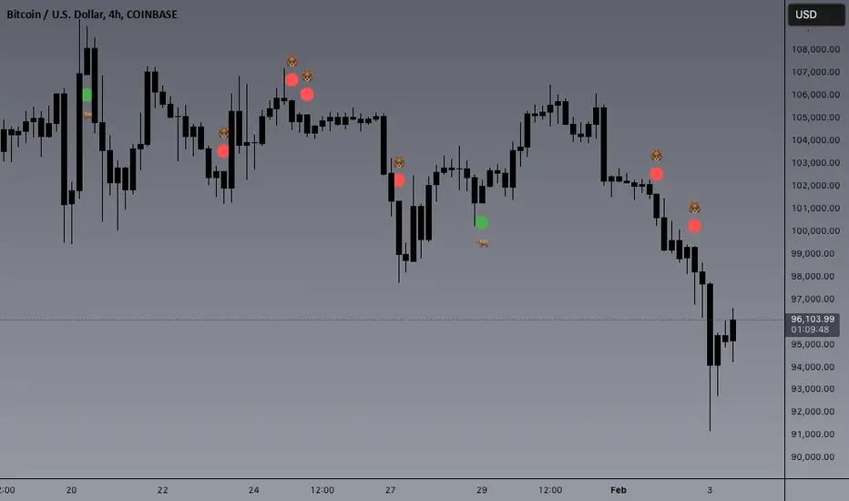 Bearish Wickless Candles: Plotted with a red circle and a "🐻" emoji above the bar.