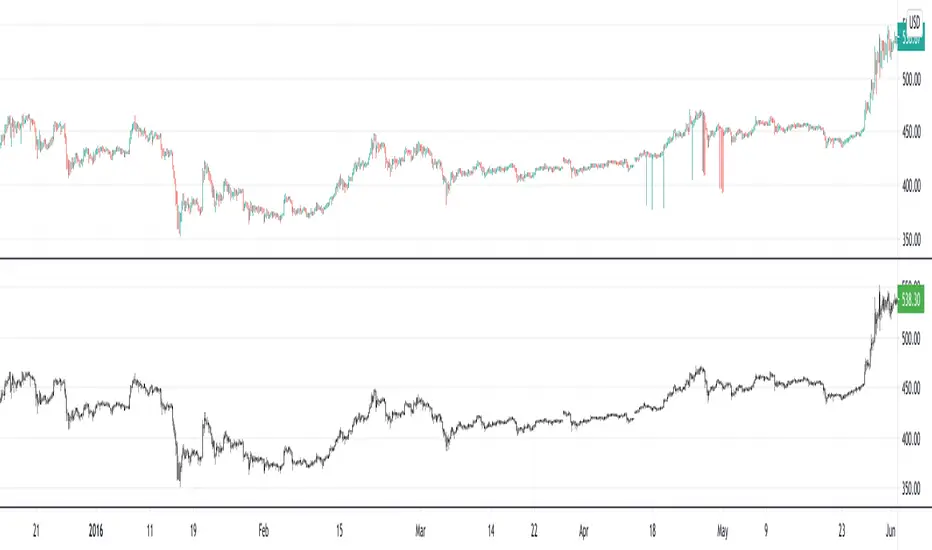 This script creates candles based on an aggregated Index price from various BTC exchange tickers. Since the early years in particular have a lot of exchange specific flash crash wicks, missing data, erraticness compared to other exchanges particularly in their first few months, this is an attempt to clean up the price history, be it for TA (trendlines, S/R etc.) or use in algos or other indicators, without reliance on one exchange. It uses the new Array functionality to generate median and averages, and is entirely original work.