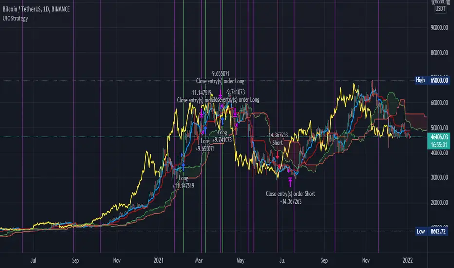The goal of this strategy script is to provide the ultimate experience to anyone interested in the Ichimoku Kinkō Hyō (Ichimoku Cloud). The script is designed to be highly customizable and allows the user to set a custom trade date range and select any combination of inputs and conditions that satisfy their goals. Additionally, the script allows the user to visually see any combination of their set conditions by clicking the "Show Conditions Visually" checkbox. Doing so will color the background in a different color where the conditions align. Finally, a simple Stop/Take profit is added for those that wish to exit based on percentages over Ichimoku conditions.
