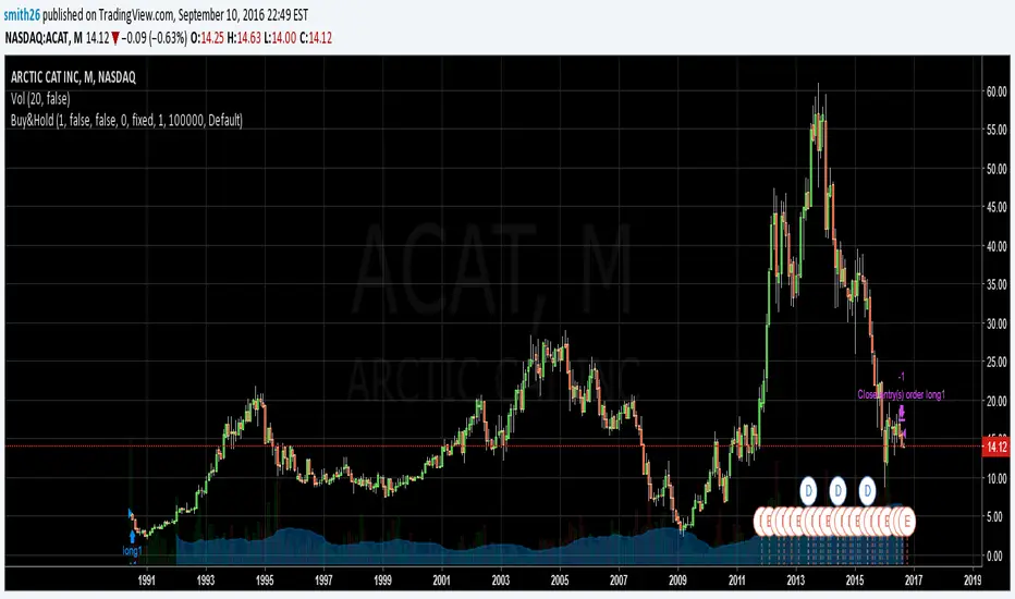 A basic Buy and Hold strategy, which is useful for comparing against your other strategies. You have to specify when you want the strategy to exit in the code, because the built in 'barstate.islast' and 'barstate.isrealtime' functions don't seem to work properly.