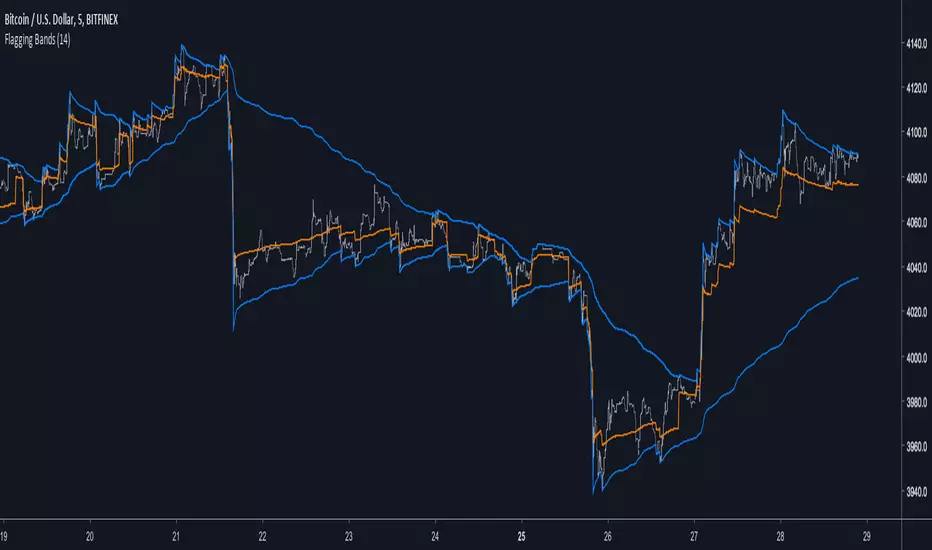 A pun between the word flag and the adjective flagging (less dynamic), this indicator have two bands who react faster when in contact to the price. Imagine you are under sheets, if you abruptly rise, the sheets will instantaneously go up, then if you abruptly get down, the sheets will fall slowly until being in contact with a surface, this is because of a type of friction called drag or air resistance, this force is described in fluid dynamics and i inspired myself from that for the creation of the indicator.