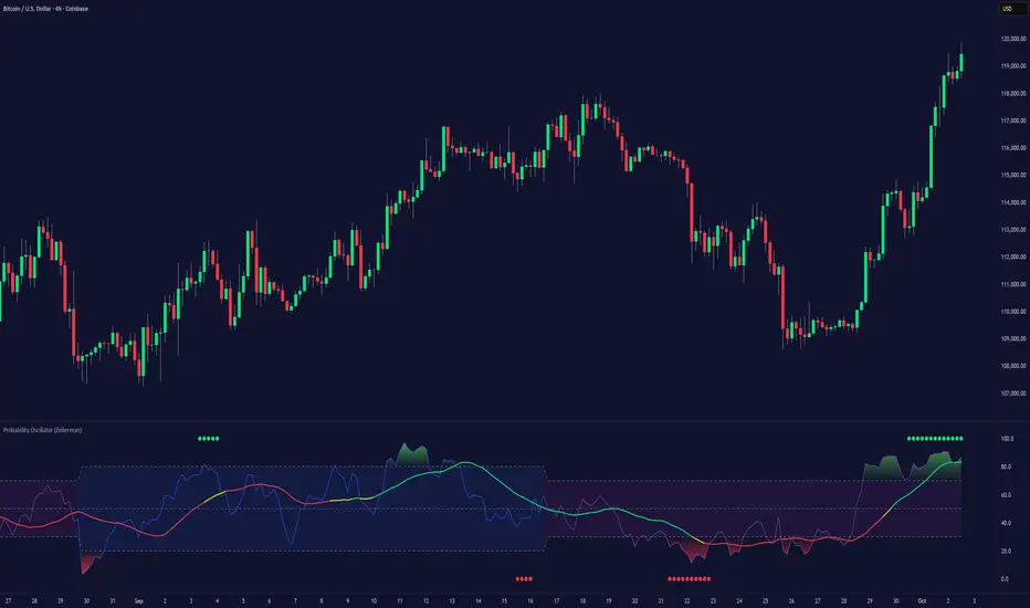 The Probability Oscillator uses a Bayesian approach to measure the probability of a price movement and trend continuation. This approach considers the prior probability of a price movement and the current market conditions to identify trends, sentiment, momentum, and retracements.