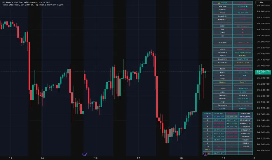 Pulse is a market bias and signal-quality analysis tool designed to evaluate directional conditions using multiple layers of contextual information. Rather than generating standalone trade entries, Pulse focuses on assessing how favorable current conditions are for directional continuation or mean reversion.