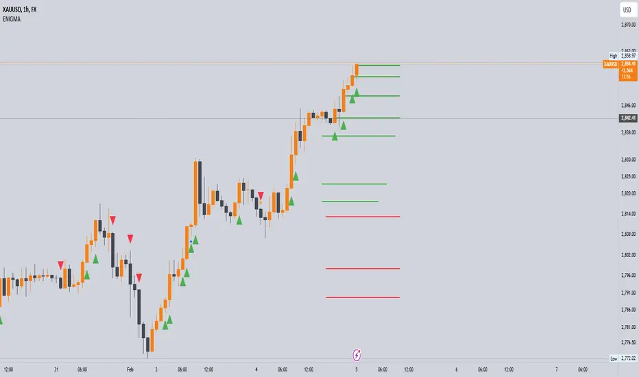 Enigma Unlocked Indicator Description & How to Use ItThe **Enigma Unlocked** indicator is a comprehensive trading tool designed to assist traders by identifying potential buy and sell signals, drawing key price levels on the chart, and tracking performance metrics such as wins, losses, and pips moved. It also offers customization for line styles, labels, and performance tracking, making it a versatile addition to any trading strategy.
