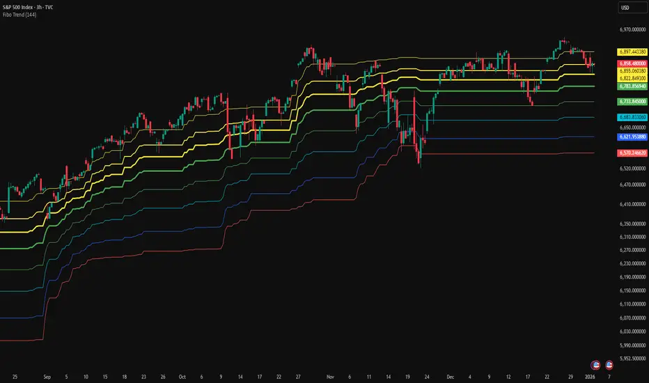 Fibo Trend is a dynamic trend-following system designed to identify key support/resistance levels and trend exhaustion points within a given period. Instead of static levels, this indicator adapts to recent price action, creating a "breathing" channel that helps traders spot reversals, continuations, and "no-trade" zones.