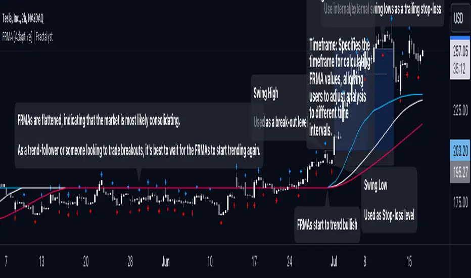 Adapting to Breaks of Structure: When a new break of structure occurs—such as a significant price movement above a previous swing high or below a swing low—the FRMA updates dynamically.