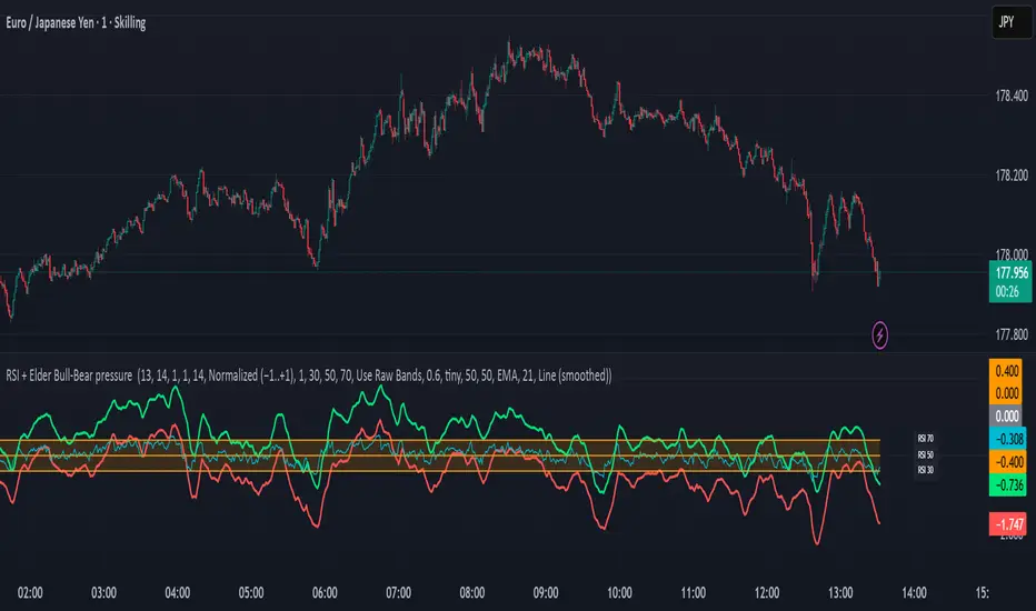 An extended RSI that overlays Elder-Ray Bull/Bear Power on the same, zero-centered scale. You get classic RSI regime cues plus a live read of buy/sell pressure, with optional smoothing, bands, and right-edge value labels.