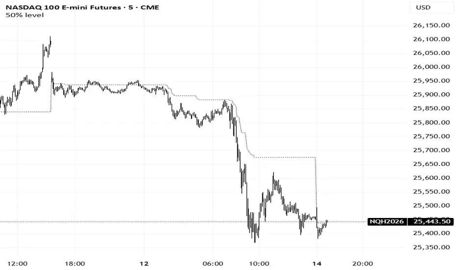 The 50% or midpoint between the current days highest and lowest points be used to divide the premium and discount of the days range. Price often reacts at this point and it can be used as a target for reversal trades. This indicator plots the level as it moves through out each day so is useful for backtesting as well as determining whether the current price is in premium or discount.