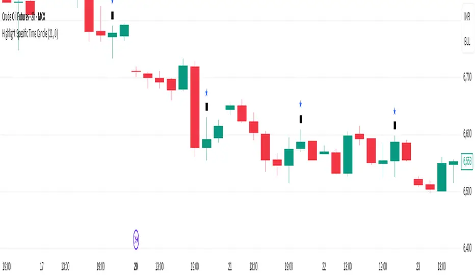This is a simple Pine Script tool that marks candles occurring at a chosen time of the day. You can set the hour and minute (in 24-hour format) from the inputs, and whenever a candle’s timestamp matches that time, the indicator highlights it with a symbol above the bar and an optional background colour.