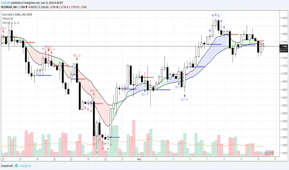 It generates signals for the comfort trading in local trend. Indicator provides information both on timing of the position entry and timing on profit fixation. Also it helps to determine the level of aggressiveness of the concrete signal. This makes «Kenji» indicator a very useful tool for amateur and experienced traders.