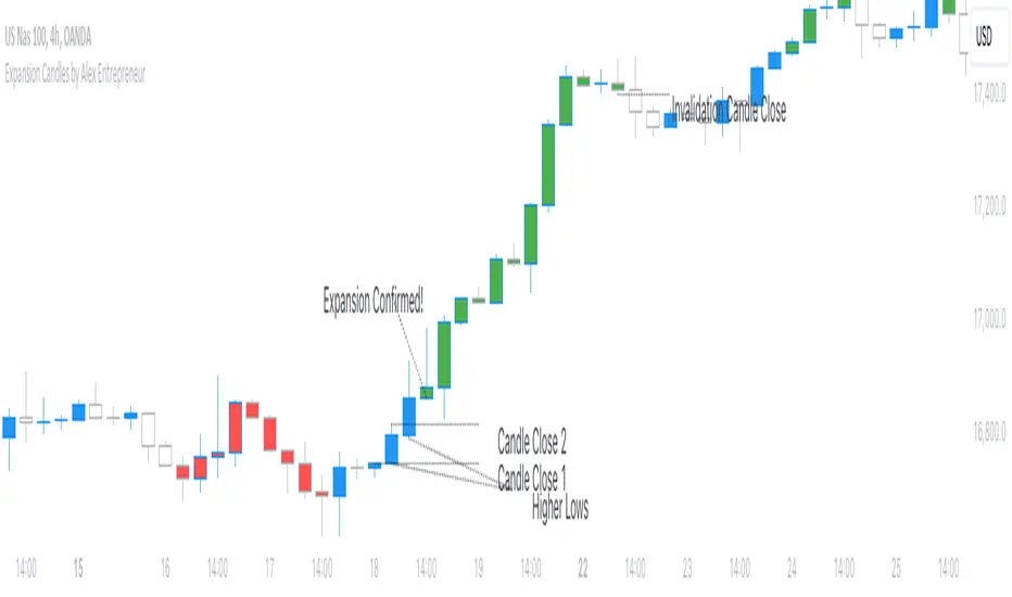 Hey people! Thanks for using Expansion Candles. I designed this tool to help me identify price runs (expansions) based on consecutive bullish or bearish candle closes and then trade continuations on the lower timeframes. Here's what makes it awesome: