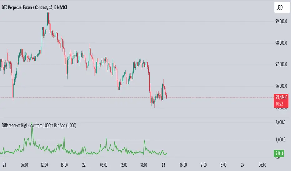 Added a line chart to visualize the difference of high and low if X (e.g., 1000th) bar from the current one. X can be adjusted as needed. Script open-source