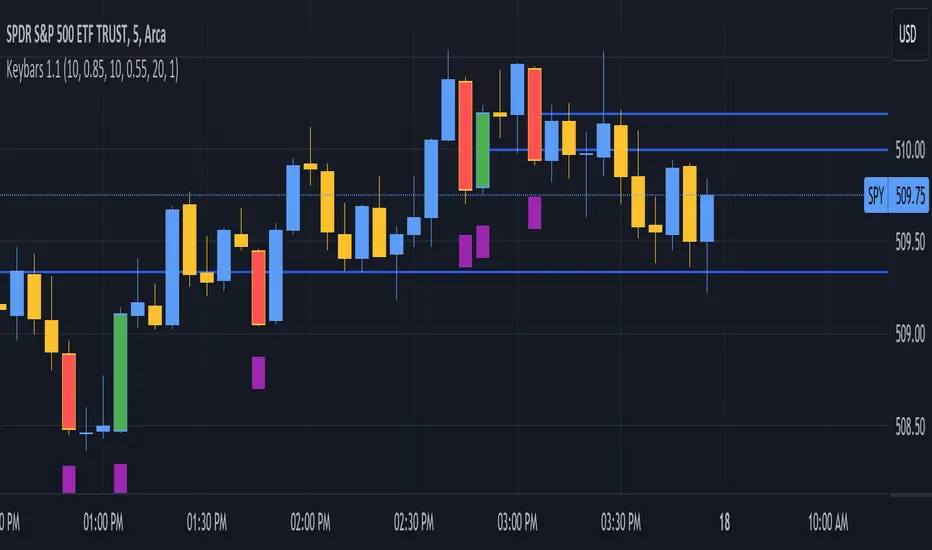 I use blue and yellow regular candles. and so the keybars are colored red and green. you may need to change this. In case the user uses other candle color overlays, the keybars are also denoted via a purple square below the candle.