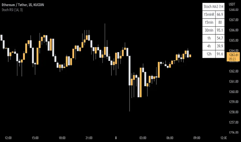This indicator calculates the Stochastic RSI for the time frames 15 min, 30 min, 1h, 4h, and 12h. However, the 15 min time frame should always be the default time frame for your chart.