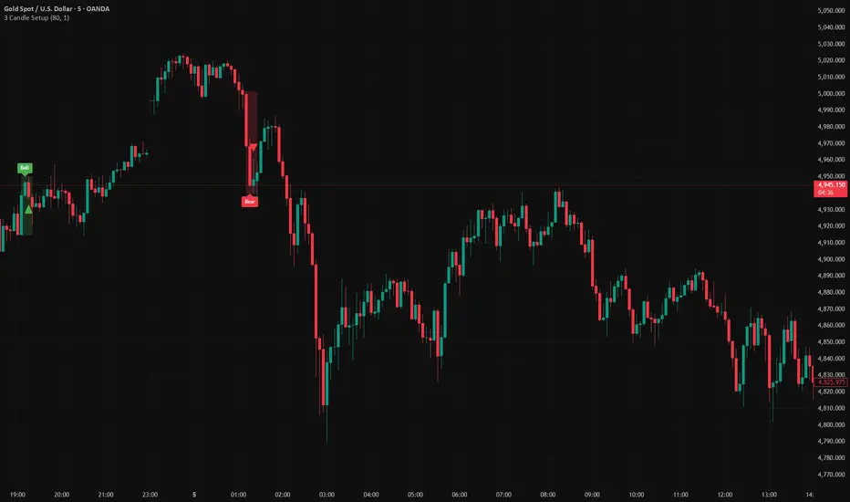 This indicator identifies high-probability continuation setups based on a 3-candle pattern that combines strong momentum with controlled pullbacks. The strategy detects when price shows explosive directional movement followed by a shallow retracement that holds key levels, signaling potential continuation.