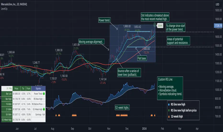 The RS Line compares a stock's performance to the S&P 500 index. A rising RS Line means the stock is outperforming the overall market. Another important signal is when the RS Line reaches a new high before price. When this occurs, it indicates strong demand for the stock and may precede a significant price increase as buyers accumulate shares. Both signals are customizable within LevelUp providing multiple visual cues when the required conditions are met.