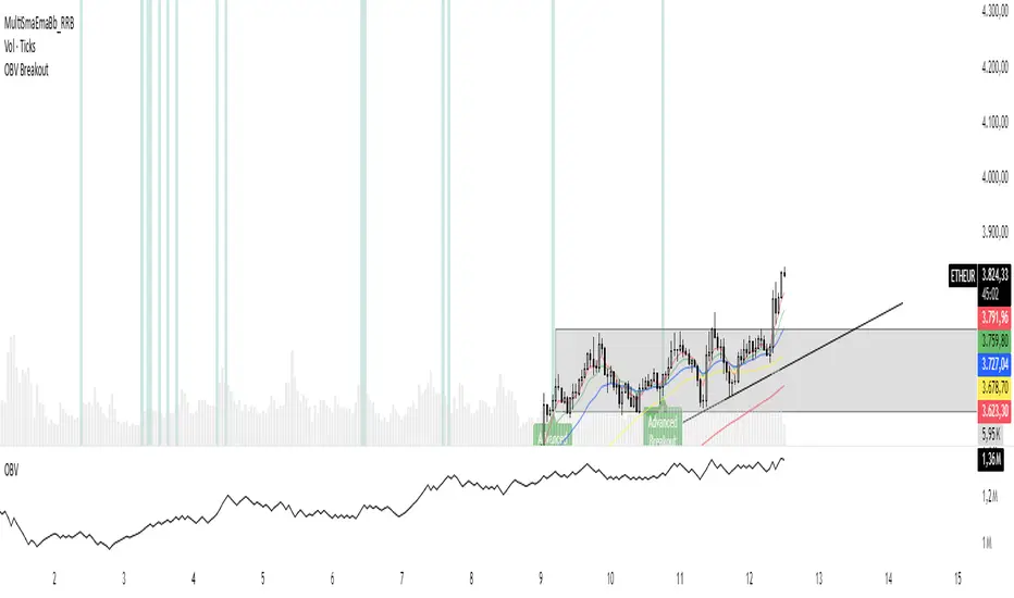 Green Triangle (▲): This symbol appears below a price candle whenever the full "Advanced Breakout" condition (OBV breakout + Price containment) is met, giving you a clear visual confirmation.