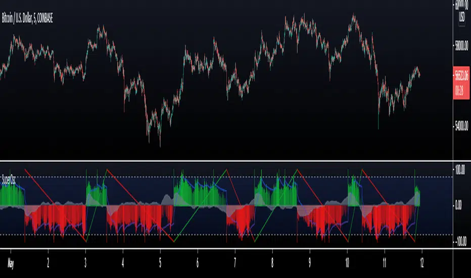 This oscillator is made of three components, all derived from the SuperTrend indicator. This approach allows the user to easily determine overbought/sold zones, identify whether a retracement is present or if the price is ranging or trending. It also allows for the anticipation of the potential price cross with the SuperTrend.