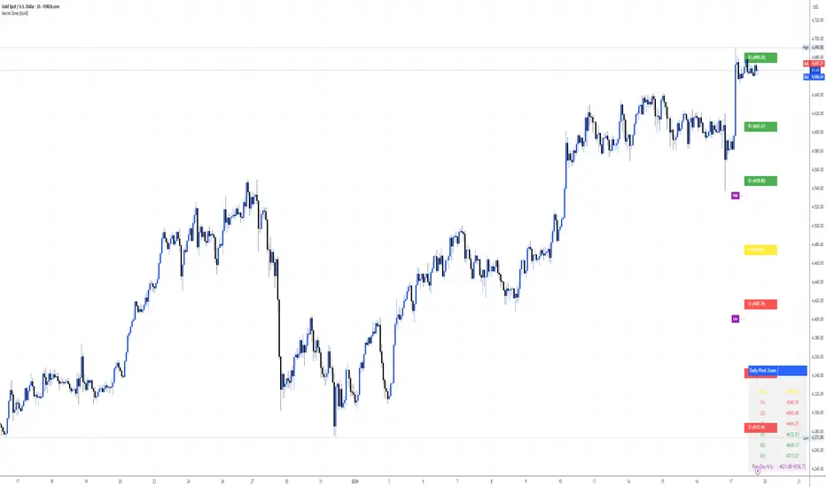 This is a Daily Pivot & Fibonacci Zone Indicator for TradingView that:Calculates daily pivot points (P, R1-R3, S1-S3) based on previous day's OHLC