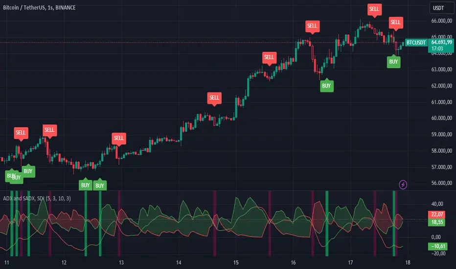 This Pine Script code is used to create a custom indicator on TradingView that helps traders identify the strength and direction of a trend. The Average Directional Index (ADX) is used to measure trend strength, while the Directional Indicators (DI+ and DI-) are used to determine the direction of the trend. The smoothed versions of these indicators (SADX and SDI) provide additional confirmation and smoothing to reduce noise and false signals. Traders can use the buy and sell signals generated by this indicator to make informed trading decisions based on the trend strength and direction.