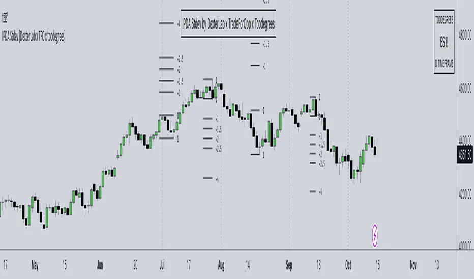 This tool was born from a collaboration between TraderDext3r, tradeforopp and I, with the objective of bringing a comprehensive IPDA Standard Deviations tool to Tradingview.