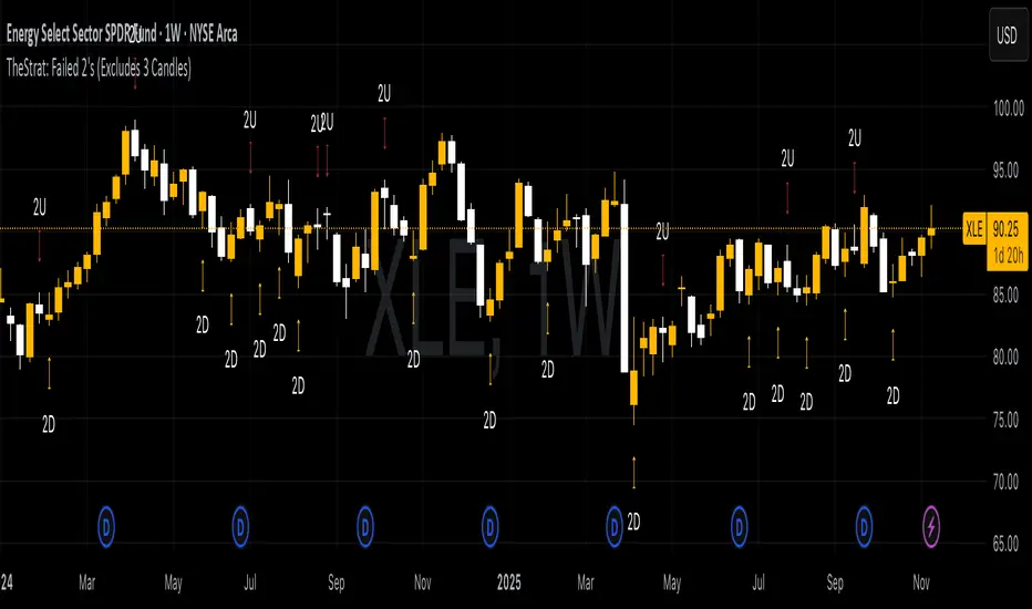 This indicator identifies and highlights Failed 2-Up (2U) and Failed 2-Down (2D) patterns in The Strat trading framework. These patterns signal a potential reversal when a 2-Up (higher high) or 2-Down (lower low) candle fails to follow through and reverses, offering high-probability trade setups.