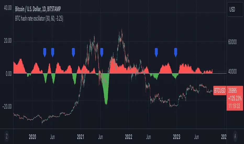 - Historical Signals: Optionally the script displays historical signals, indicating past instances where hash rate conditions suggested favourable entry points. Users can also assess the script's historical performance.
